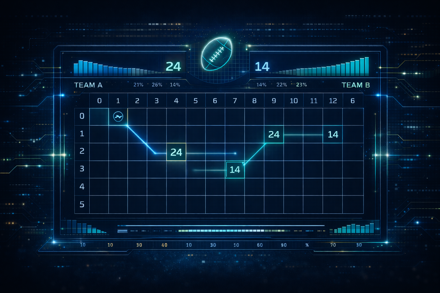7 appears constantly because touchdowns plus extra points equal 7, and multiples of 7 (14, 21, 28) are staple football scores. A team that scores two touchdowns with successful PATs sits at 14 — ending digit 4 on one axis, often paired with 7 or 0 on the other.